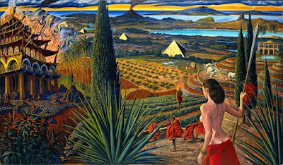 Historical figures and semi legendary figures are contemporary here, the Roman Empire has fallen and we are in a permanent quasi-Neolithic/ ancient/ classical/ medieval/ renaissance. Figures like Theseus rule Athens, Priam rules Troy, Midas rules Phrygia, the Medici dynasty rules Florence, Arthur is King of the Britons, Alfred King of the Saxons, Ptolemy XXXVIII is Pharaoh of Egypt, Cuauhtemoc is Emperor of Mexico and Haroun Al Rashid is Caliph in Baghdad with Nebuchadnezzar King of Babylon. It is a big mixed up world; I stopped short of making Elvis King of America.